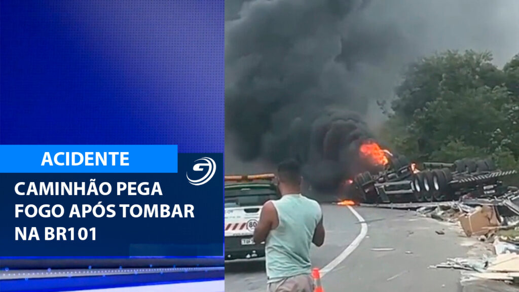 CAMINHÃO PEGA FOGO APÓS TOMBAR NA BR101