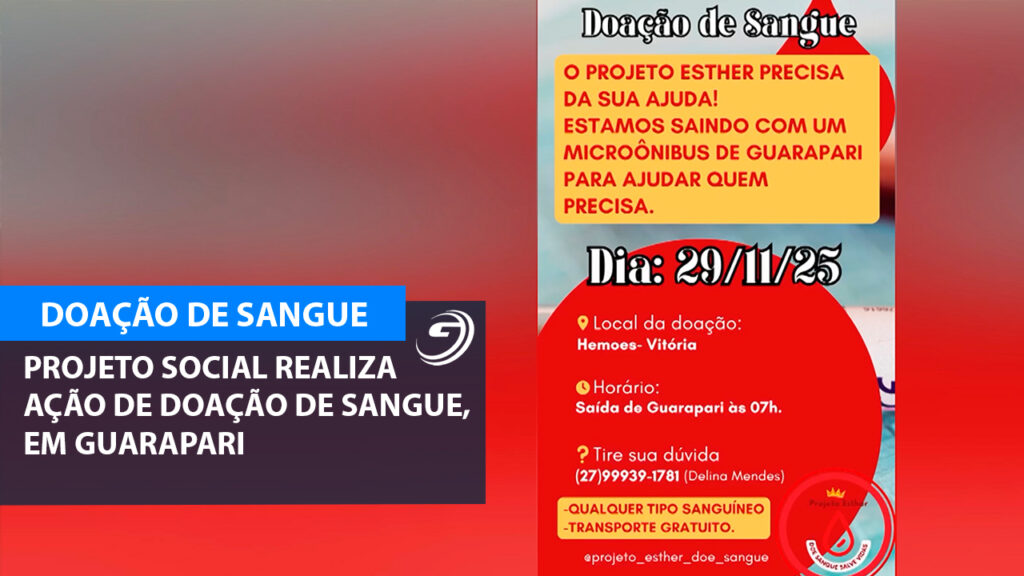 O Projeto Esther vai realizar uma ação levando doadores de sangue de Guarapari até o Hemoes, em Vitória, no próximo sábado (29). #JornalGuarapari #Guarapari #Notícias #TVGuarapari