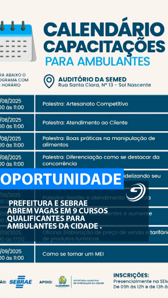 PREFEITURA E SEBRAE ABREM VAGAS EM 9 CURSOS QUALIFICANTES PARA AMBULANTES DA CIDADE