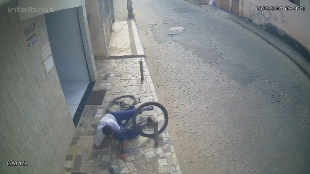 Ciclista de 38 anos se feriu ao passar por um buraco no bairro Jabaraí. Uma câmera de segurança registrou quando ele se desequilibrou e caiu no chão.