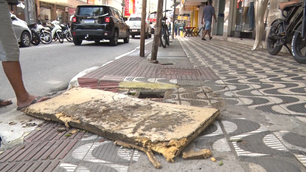 Uma tampa da rede de esgoto foi retirada de uma calçada na Rua Getúlio Vargas no centro da cidade.