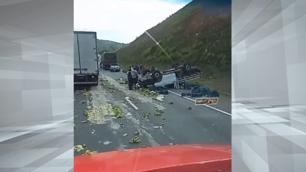 Nesta quinta-feira uma caminhonete carregada de bananas capotou na BR101