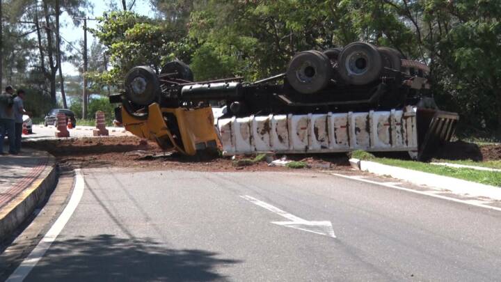 Caminhão capotou na Rodovia do Sol e motorista sofre ferimentos leves