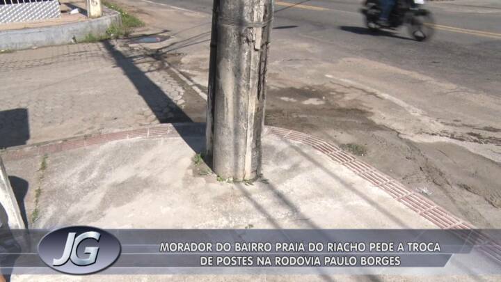 Um morador da Rua Guaçuí reclama de dois postes deteriorados, na Praia do Riacho. Um deles está inclinado e ameaça cair. A comunidade chamou e o Repórter nos Bairros foi até lá.