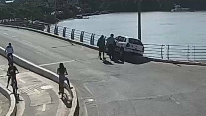 Motorista de carro de passeio perde controle do veículo e quase cai da ponte da cidade