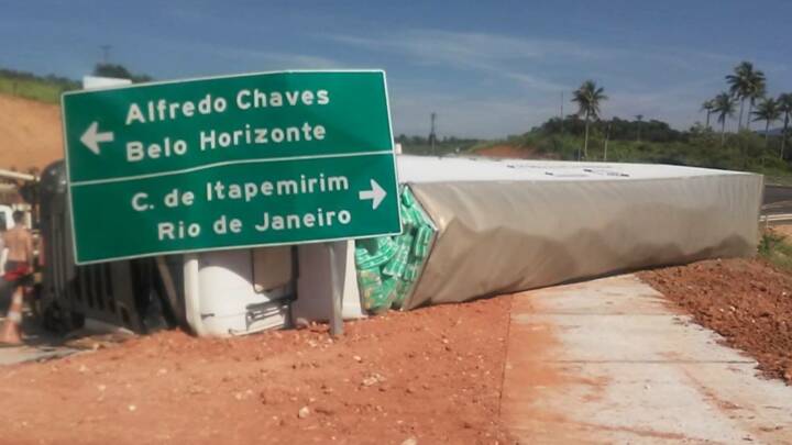 Uma carreta carregada com fraldas descartáveis tombou no quilômetro 358, da BR 101, próximo ao trevo de Alfredo Chaves. De acordo com a PRF, o motorista estava sozinho no veículo e sofreu escoriações leves, e não precisou ser encaminhado ao serviço médico.