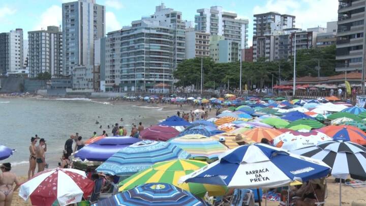 E se tem muita gente chegando em Guarapari, o resultado é praia lotada. Olha só o movimento nas praias pela manhã.