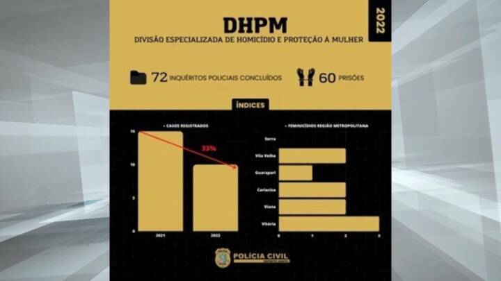 Dados da polícia civil apontam que houve uma redução nos casos de feminicídio nos municípios da grande Vitória. O balanço registrou uma queda de 33% de casos de 2022 comparado com 2021.
