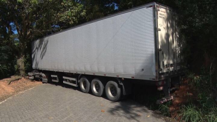 Caminhão baú fica atravessado na estrada de acesso à comunidade Buenos Aires