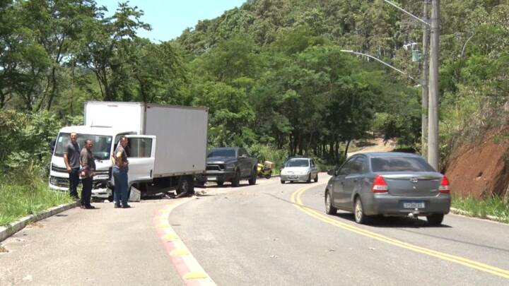 Acidente entre caminhão baú e carro de passeio na manhã deste sábado